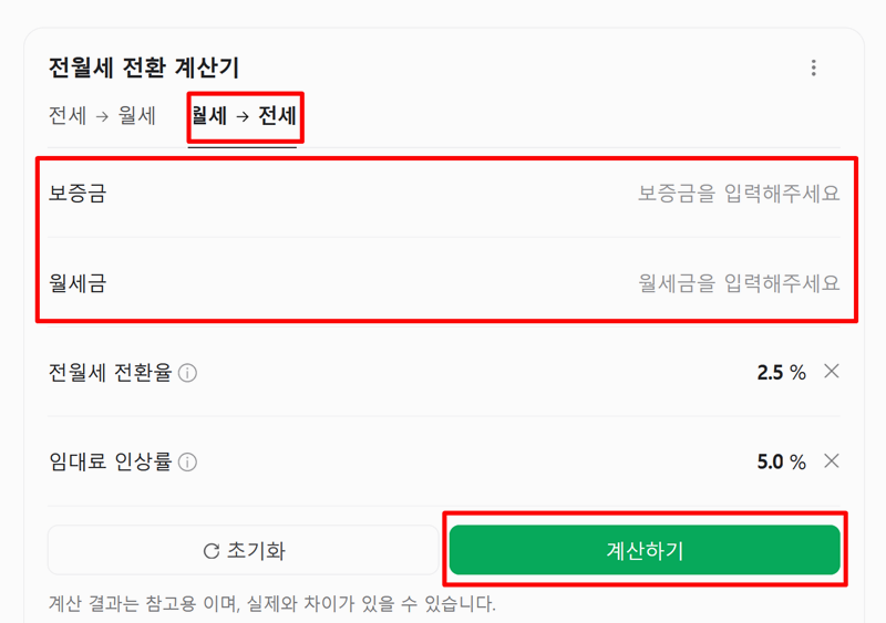 3. 월세에서 전세로 갈 때에 전월세 전환 계산도 가능합니다. 보증금과 월세를 입력하면 전월세 전환율을 반영해 예상 금액을 계산할 수 있어요. 임대료 인상률을 통해 변동 가능성을 확인하는 데 도움을 줍니다.