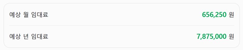 2. 계산 완료 후에는 예상 월 임대료 및 연 임대료를 간단하게 확인이 가능해요. 계산 결과는 참고용이며 실제 계약과 차이가 있을 수 있어요.