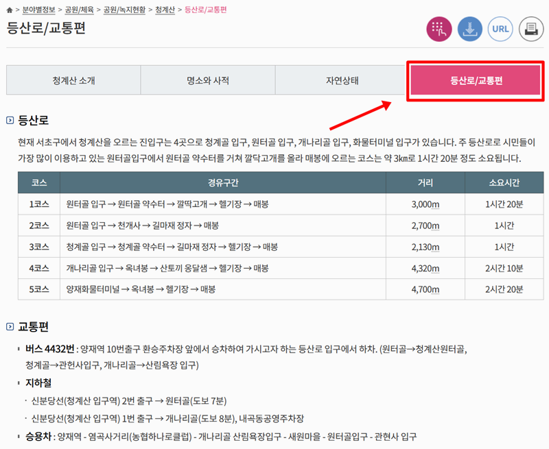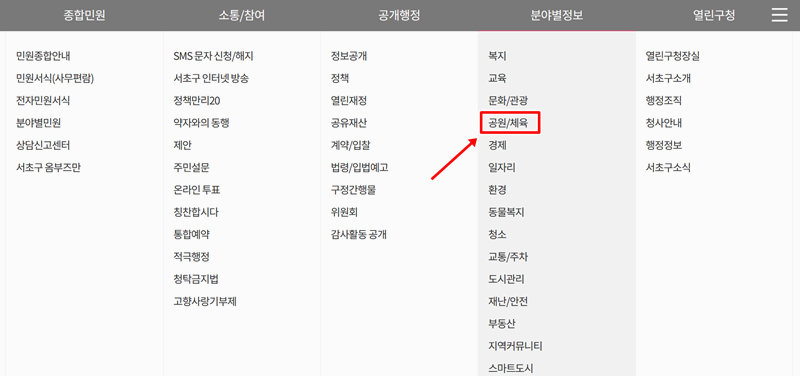 2. 서초구청 홈페이지에는 종합민원, 소통/참여, 공개행정, 분야별정보, 열린구청 같은 다양한 카테고리가 있어요. 그중에서도 분야별정보에서 공원/체육 항목을 보면 청계산과 관련된 내용을 찾을 수 있어요. 지역 내 자연 공간과 운동 시설에 대한 정보가 정리되어 있어 등산 전 미리 참고하면 도움이 될 거예요.