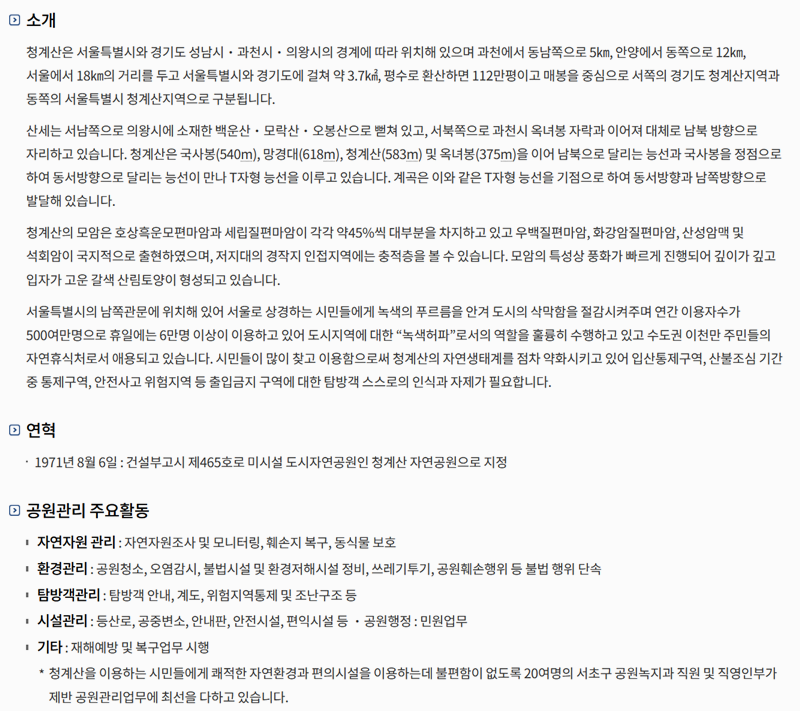 4. 청계산 소개로 들어가면 청계산에 대한 간단한 정보를 볼 수 있어요. 청계산이라는 이름은 이곳에서 흐르는 맑은 물에서 유래된 것으로 보이지만 정확한 기록은 없어요. 예전에는 청룡산이라고 불린 적도 있으며 산 이름이 주변 지형과 관련이 있다는 해석도 있어요. 또한 청계산은 청동기 시대부터 사람들이 거주했던 곳이며 고려 유신들이 은거했던 역사적인 장소로도 알려져 있어요.