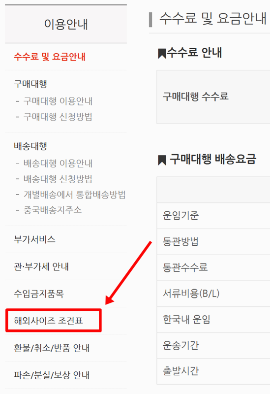 2. 이용 안내 좌측에서 보시면 다양한 메뉴가 있는데 여기서 [해외사이즈 조견표] 메뉴로 들어갑니다.