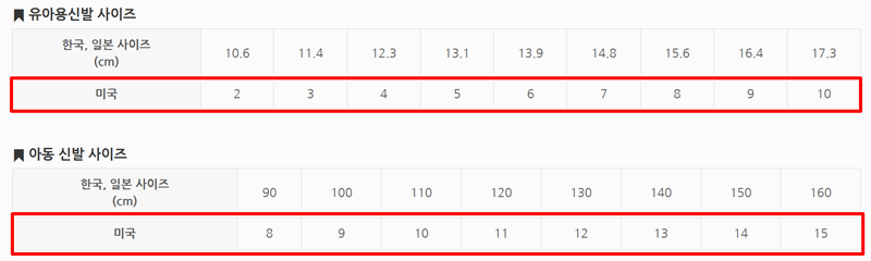 7. 그리고 밑에서 유아용, 아동 신발사이즈 미국 조견표도 살펴 볼 수 있었는데요. 한국과 일본은 cm 단위로 발 길이를 표시하며 미국은 숫자만 사용합니다. 특히 유아용과 아동용 사이즈는 연령별 발 성장에 따라 세분화되어 있어 정확한 사이즈 선택이 필요합니다.