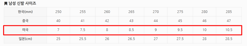 6. 남성 신발 사이즈는 나라마다 표기 방식이 달라 혼란스러울 수 있습니다. 한국은 mm 단위로 발 길이를 표시하고 미국은 숫자와 소수점을 사용하며 중국은 40부터 시작하는 숫자 체계를, 일본은 cm 단위로 표기합니다.