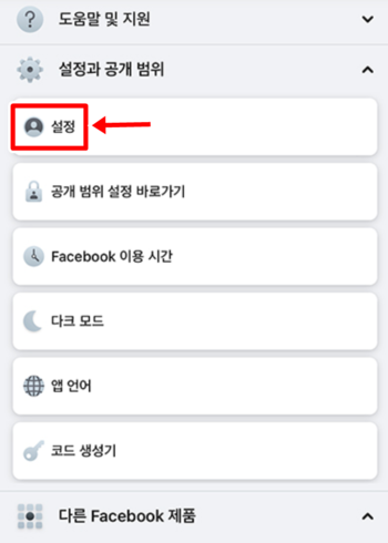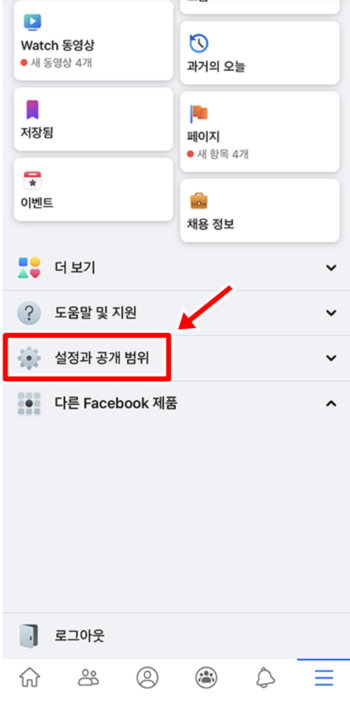 2. 메뉴 화면에 들어오셨다면 화면을 아래로 쭉 내려보세요. 아래쪽으로 내리면 여러 가지 메뉴가 나옵니다. 여기서 ‘설정과 공개 범위’라는 항목을 찾은 뒤 선택해 주세요.