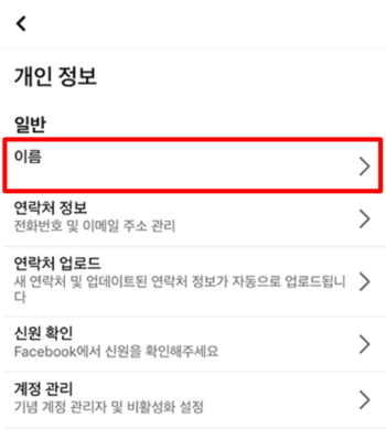 5. 개인 정보 메뉴에 들어왔다면 가장 첫 번째로 ‘이름’ 항목이 나옵니다. 이 부분을 눌러 이름을 수정할 수 있는 화면으로 이동해 주세요. 이제 새로운 이름을 입력할 준비가 되었습니다.