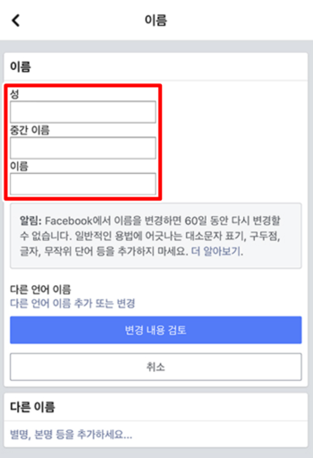 6. 이름 변경 페이지에서는 성, 중간 이름, 이름 이렇게 세 가지 칸에 입력할 수 있습니다. 원하는 이름을 각각 알맞은 칸에 작성해 주세요.