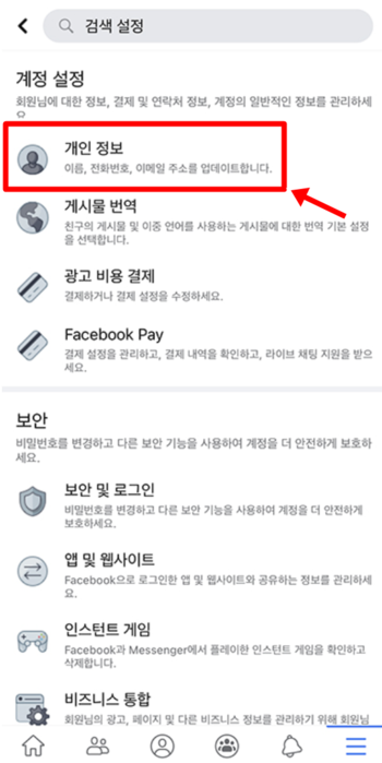 4. 이제 화면 상단에 ‘계정 설정’이라고 적힌 부분이 보일 거예요. 이곳에서는 이름, 전화번호 또는 이메일 주소 등을 변경할 수 있는 개인 정보 메뉴가 있습니다. 이 메뉴를 눌러 다음 단계로 넘어가 주세요.