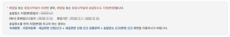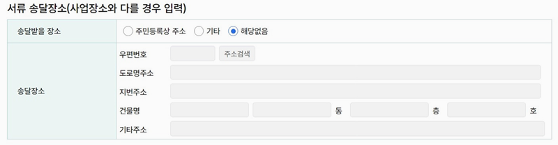 4. 서류 송달장소를 지정하는 항목이 있으며 사업장과 송달장소가 다를 경우 송달받을 주소를 입력해야 합니다. 예를 들어 주민등록상 주소나 기타 주소를 입력할 수 있으며 폐업일이나 휴업시작일이 미래일 경우 송달장소도 변경이 가능합니다.