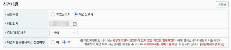 3. 신청 내용에서는 휴업신고서 또는 폐업신고서를 선택하고 폐업일자와 휴업(폐업) 사유를 입력해야 합니다. 또한 폐업자 멘토링 서비스를 신청할지 여부를 선택할 수 있으며 이 서비스를 신청하면 세무 전문가로부터 무료 세무 자문을 받을 수 있습니다.