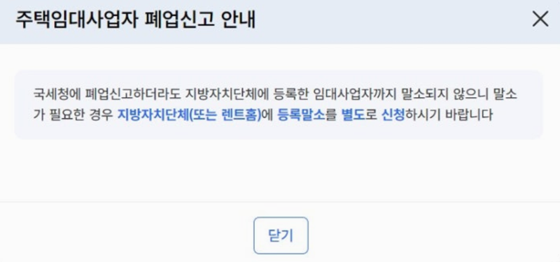 7. 국세청에 폐업신고를 완료하셨다면 지방자치단체에 등록된 임대사업자 정보는 자동으로 말소되지 않습니다. 만약 임대사업자로 등록된 정보도 삭제하고 싶다면 별도로 지방자치단체나 렌트홈에 방문해 등록말소 신청을 해야 합니다. 이 점을 꼭 확인하시고 추가적인 절차를 진행하시기 바랍니다.