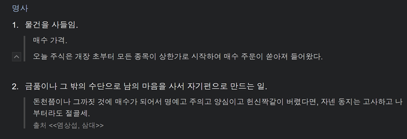 1. 매수는 한자로 買收라고 쓰며 발음은 '매ː수'입니다. 이 단어는 주식이나 자산을 사들이는 것을 의미해요. 흔히 투자나 거래에서 많이 쓰이지만 일상생활에서는 잘 쓰이지 않다 보니 처음 들으면 조금 낯설게 느껴질 수 있어요. 매수에서 파생된 단어로는 매수되다와 매수하다가 있습니다.