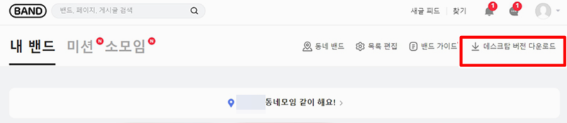2. 로그인 후 계정에 접속하면 가입한 밴드 목록이 화면에 표시됩니다. 이 목록을 보면 지금까지 가입했던 밴드들이 한눈에 정리되어 있어 원하는 밴드를 쉽게 찾을 수 있습니다. 화면의 우측 상단을 보면 데스크탑 버전 다운로드를 위한 버튼이 보이는데요. 이걸 누르면 PC에서 밴드를 사용할 수 있도록 도와주는 프로그램을 받을 수 있습니다.