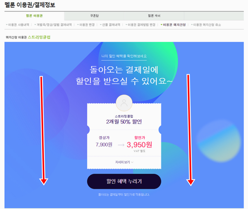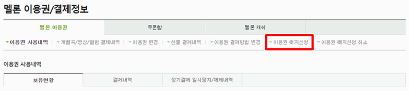 2. 이용권 페이지에 들어오면 현재 사용 중인 멜론 이용권과 결제 정보가 보입니다. 하단에는 사용 내역이 표시되고 이용 기간과 지원되는 서비스 그리고 다음 결제일 같은 정보가 정리되어 있습니다. 이제 여기서 위쪽 메뉴를 살펴보면 이용권 해지를 진행할 수 있는 부분이 있으니 찾아서 눌러야 합니다.