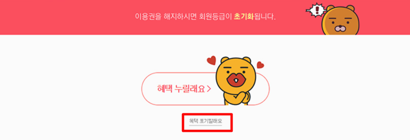 6. 화면을 아래쪽까지 내리다 보면 작은 글씨로 혜택을 포기하겠다는 선택지가 보일 것입니다. 이 부분을 선택하면 다음 단계로 넘어가게 되는데요. 이용권을 해지하면 기존에 유지되던 회원 등급이 초기화된다는 안내도 함께 나오니 참고하시면 좋겠습니다.