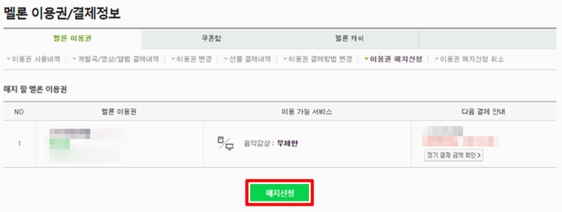 4. 비밀번호를 입력하면 다시 기존 화면과 비슷한 페이지가 나타납니다. 하지만 이번에는 이용권 설명 부분 옆쪽에 해지를 신청할 수 있는 버튼이 추가된 것을 확인할 수 있습니다. 이제 이걸 눌러 다음 단계로 넘어가면 됩니다.