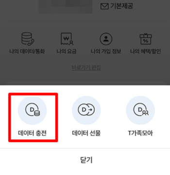 2. 화면 아래쪽에는 데이터 충전, 데이터 선물, T가족모아 등 세 가지 메뉴가 보입니다. 여기서 충전을 선택하면 직접 데이터를 추가할 수 있습니다. 필요한 경우 이곳에서 모든 과정을 한 번에 확인할 수 있어 처음으로 되돌아갈 필요가 없습니다.
