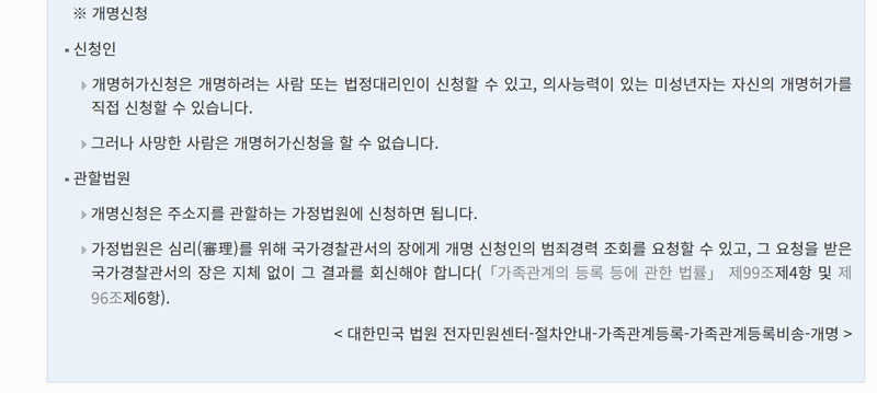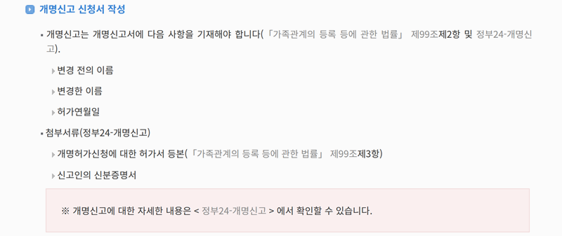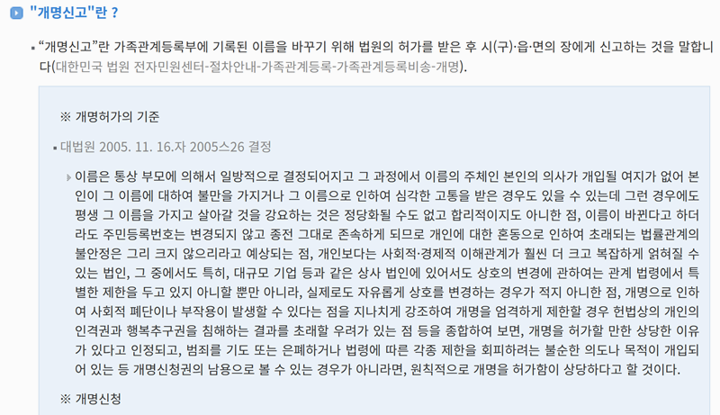 1. 여기서 자세한 개명신고 방법 및 이름 한자 바꾸기에 대해서 자세하게 나와 있는데요. 이름 한자도 개명 신고가 필요한 부분 입니다. 개명신고는 공식 문서에 등록된 이름을 새로운 이름으로 변경하기 위해 법원의 허가를 받은 후 행정기관에 알리는 절차입니다. 단순히 이름을 바꾸고 싶은 마음만으로는 진행할 수 없으며 정해진 절차를 따라야 합니다.