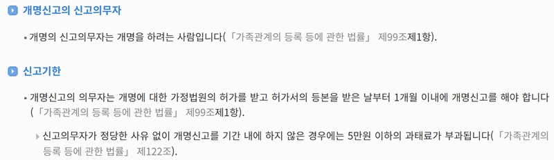 3. 개명을 신청한 사람은 법원의 허가를 받은 후 1개월 이내에 개명 신고를 해야 합니다. 허가서 등본을 받은 날부터 기한이 시작되며 정당한 사유 없이 신고하지 않으면 5만 원 이하의 과태료가 부과될 수 있습니다. 개명 신고는 본인이 직접 해야 하며 필요한 서류를 갖춰 주소지 관할 행정복지센터나 구청에 제출하면 됩니다.