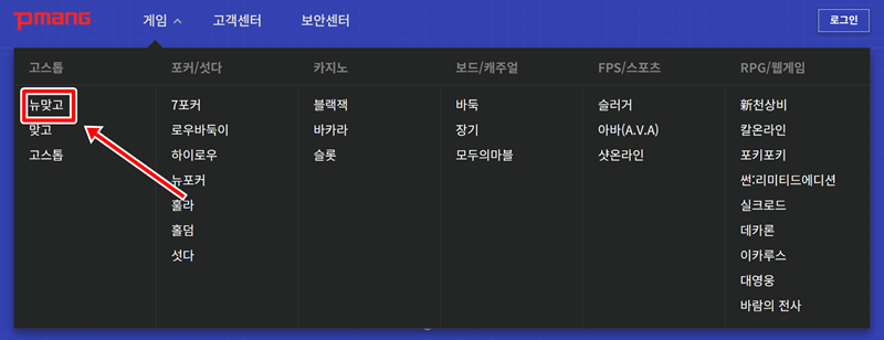 2. 상단 게임 카테고리에서 다양한 장르의 게임을 한눈에 살펴볼 수 있습니다. 고스톱, 포커 같은 카드 게임부터 보드게임, RPG, FPS 등 폭넓은 선택지가 마련되어 있습니다. 원하는 게임을 찾아 즐길 수 있도록 구성되어 있으며 각 게임별로 특색 있는 재미를 느낄 수 있습니다. 여기서 뉴맞고로 들어갑니다.