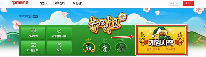 3. 피망 계정이 있다면 로그인 후 바로 진행하면 되고 처음 이용하는 분들은 간단한 절차를 통해 가입을 완료하시면 됩니다. 로그인까지 마쳤다면 게임시작을 눌러주시면 됩니다. 그러면 자연스럽게 피망 신형 맞고 설치가 시작됩니다.