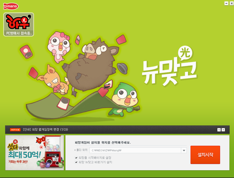 5. 경로 지정과 바로 가기 설정만 해주면 되며 다른 부분은 따로 손댈 필요가 없습니다. 컴퓨터 바탕화면에서 빠르게 실행하려면 피망 신형 맞고 바로 가기 설정을 확인한 후 설치를 진행하면 됩니다.