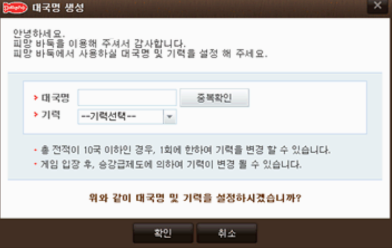 6. 처음으로 게임을 실행하면 대국에서 사용할 별명을 설정해야 합니다. 원하는 이름을 입력한 후 기력을 선택하면 게임을 진행할 준비가 완료됩니다. 자신의 실력에 맞는 기력을 선택하면 보다 적절한 상대와 대국을 즐길 수 있습니다.