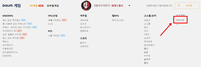 2. 다양한 장르의 온라인 게임을 한눈에 살펴볼 수 있습니다. MMORPG, 슈팅, 스포츠, 보드 등 여러 종류의 게임이 정리되어 있어 원하는 게임을 쉽게 찾을 수 있습니다. 가장 우측 보드게임에서 피망바둑을 찾을 수 있습니다.