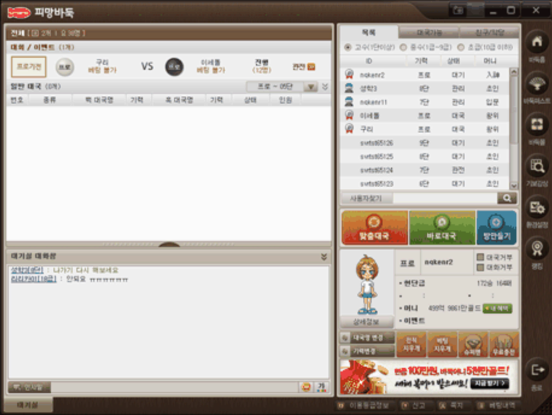 7. 게임이 정상적으로 실행되면 대기실 화면으로 이동하게 됩니다. 여기서 원하는 방에 입장하거나 직접 방을 만들 수 있으며 다른 이용자들과 대국을 준비할 수 있습니다.