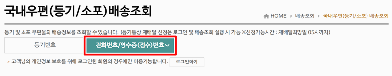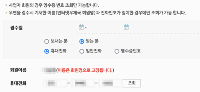 6. 로그인한 뒤 접수일을 선택하고 보내는 사람과 받는 사람 정보를 입력하면 조회가 가능합니다. 여기에 휴대전화 번호나 영수증 번호를 입력한 뒤 조회 버튼을 누르면 배송 진행 상황을 상세히 확인할 수 있습니다.