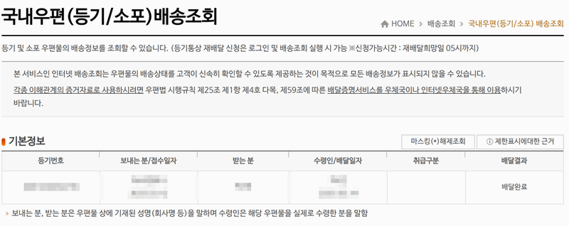 3. 등기번호를 입력해 조회하면 기본정보가 나타납니다. 여기에서 보내는 사람, 받는 사람, 배달 결과 등의 내용을 확인할 수 있습니다. 배송이 정상적으로 진행되고 있는지, 이미 배달이 완료되었는지를 바로 알 수 있어 편리합니다.