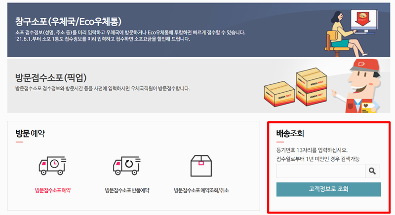 2. 메뉴로 이동한 후 화면 우측을 보면 배송 조회 항목이 있습니다. 여기에 소포나 택배의 등기번호 13자리를 입력한 뒤 돋보기 모양 아이콘을 눌러 조회하면 됩니다. 만약 등기번호를 모른다면 고객정보로 조회하는 방법도 있습니다. 이 경우 회원가입이 필요하다는 점 참고하면 좋습니다.