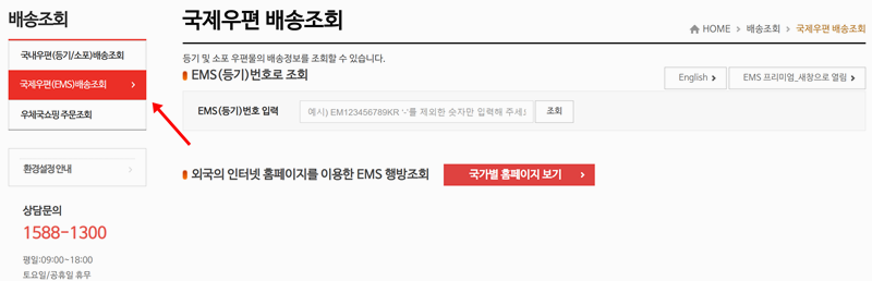 7. 국제우편 배송 조회도 EMS 등기번호를 입력하면 배송 상태를 확인할 수 있어요. 해외 배송의 경우 각 나라의 홈페이지를 통해 상세한 정보를 확인할 수도 있으며 상담 문의는 평일 운영하며 토요일과 공휴일은 휴무 입니다.