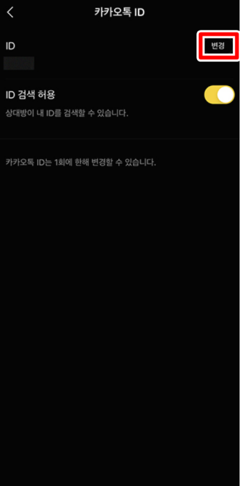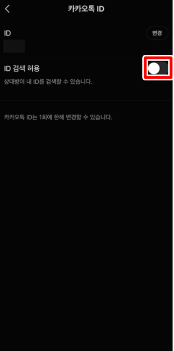 4. 아이디 설정 화면으로 이동하면 내 카카오톡 아이디가 화면 상단에 표시됩니다. 만약 아이디를 변경하고 싶다면 변경 버튼을 눌러서 진행하면 됩니다. 또한 다른 사람들이 나를 친구로 추가할 수 있도록 하려면 ID 검색 허용 기능을 활성화해야 합니다. 이 기능이 꺼져 있으면 상대방이 내 아이디를 입력하더라도 검색 결과에 나타나지 않습니다.