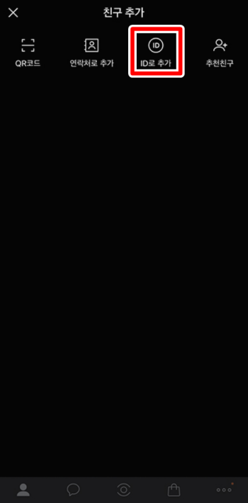 2. 친구 추가 방법은 여러 가지가 있는데 그중에서 ID로 추가하는 기능을 선택하면 됩니다. 이 버튼을 누르면 입력창이 나타나며 여기에 친구의 카카오톡 아이디를 입력하면 해당 사용자를 검색할 수 있습니다. 아이디를 모르면 검색할 수 없지만 이 과정을 통해 자신의 아이디도 쉽게 확인할 수 있습니다.