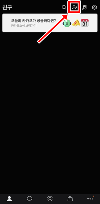 1. 카카오톡 아이디를 확인하려면 먼저 카카오톡 앱을 실행한 뒤 화면 상단을 살펴보세요. 사람 모양 아이콘이 보일 텐데요. 이 아이콘에는 작은 + 표시가 함께 붙어 있습니다. 이 부분을 눌러주면 친구를 추가할 수 있는 다양한 방법이 나오는데 여기에서 아이디와 관련된 기능을 찾을 수 있습니다.