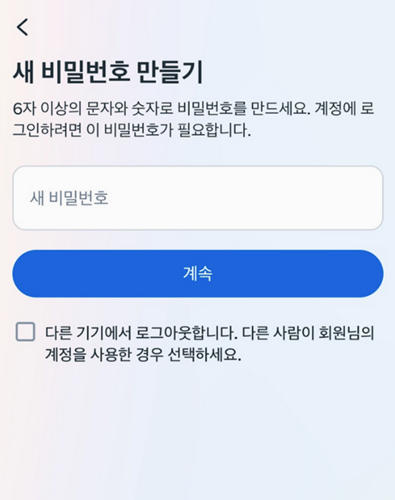 6. 새 비밀번호를 설정하는 화면이 나오면 최소 6자 이상의 문자와 숫자를 섞어서 새로운 비밀번호를 만들어요. 이때 보안을 위해 다른 사람들이 쉽게 알 수 없는 비밀번호로 설정하는 게 좋아요.