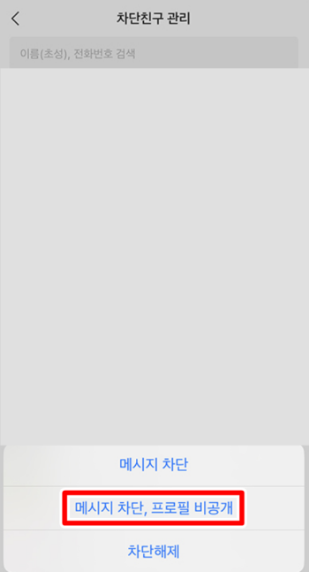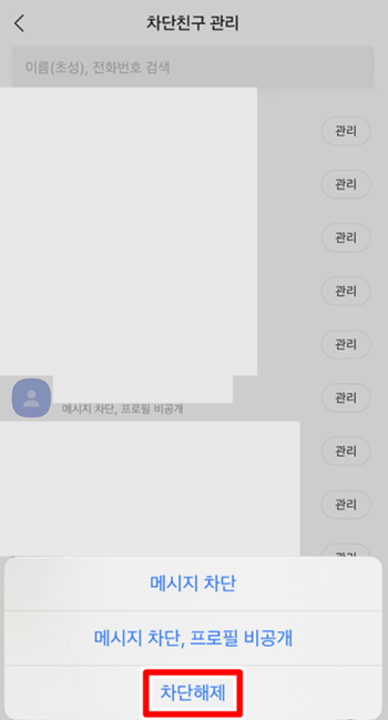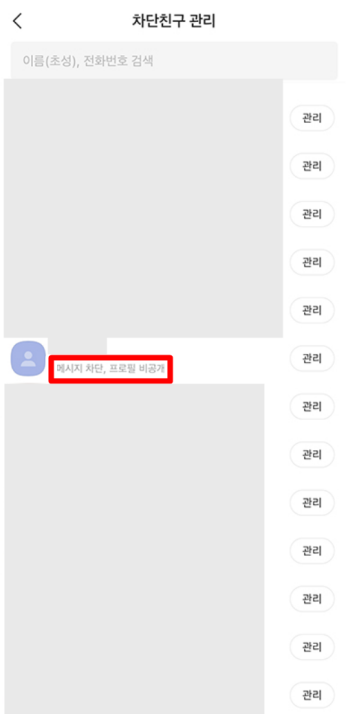 5. [차단친구 관리]메뉴에 들어가면 차단한 친구 목록이 나타납니다. 이 목록에서 차단한 사람을 확인할 수 있으며 기본적으로는 메시지만 차단된 상태입니다. 더 많은 설정이 필요할 수 있습니다. 차단된 친구 목록에서 관리 버튼을 누르고 [메시지 차단]과 [프로필 비공개]를 선택합니다. 이렇게 하면 메시지가 차단될 뿐만 아니라 상대방은 내 프로필도 볼 수 없게 됩니다. 추가 설정을 통해 더 철저한 차단이 이루어집니다.