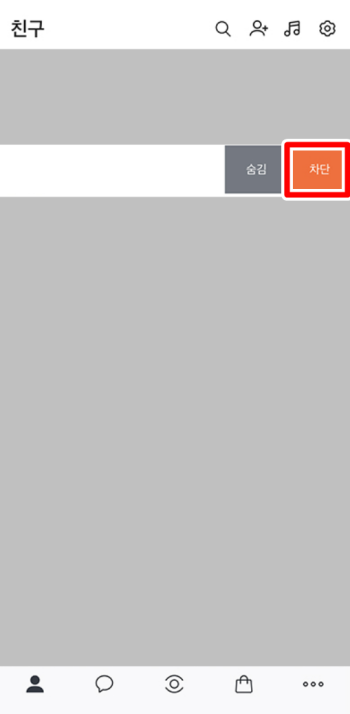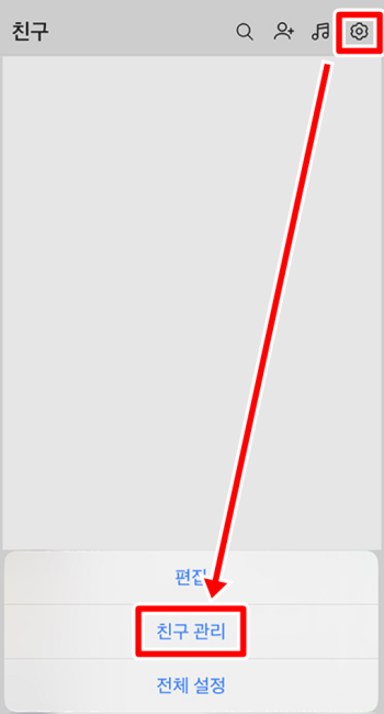 3. 차단 설정은 매우 간단하게 완료됩니다. 하지만 차단만으로 끝내지 않고 상대방이 내 프로필을 볼 수 없게 하려면 추가적인 설정이 필요합니다. 화면 상단 오른쪽에 톱니바퀴 모양의 아이콘을 찾아 눌러주세요. 톱니바퀴 아이콘을 누르면 여러 설정 항목이 나오는데 그 중에서 [친구 관리]를 선택합니다.