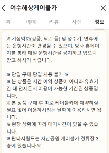 8. 정보에서 볼 수 있는 내용으로 기상 악화나 성수기, 연휴에는 케이블카 운행시간이 달라질 수 있으니 홈페이지에서 확인해 주세요. 이 상품은 예약이 필요 없는 기간권 상품으로 구매 후 언제든 이용 가능합니다. 현장에서 대기 시간이 발생할 수 있습니다.
