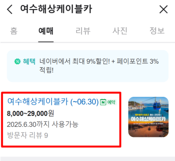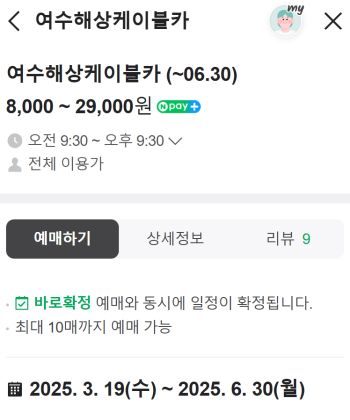 3. 간략한 소개가 보이는데요. 여수 해상 케이블카는 오전 9시 30분부터 오후 9시 30분까지 운영되며 요금은 8,000원에서 29,000원까지 다양합니다. 예매 후 바로 확정되며 최대 10매까지 예매할 수 있습니다.