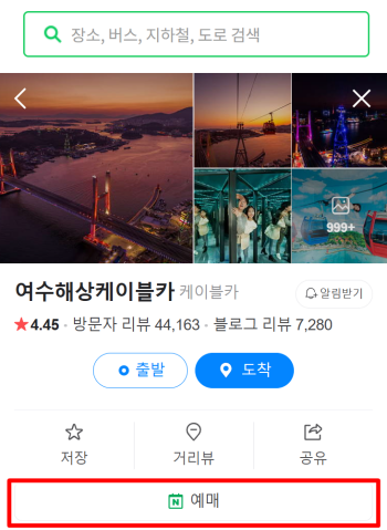 1. 이 곳에서 케이블카의 지도, 주소, 요금, 예약, 운영 시간 등을 확인할 수 있는데요. 방문자 리뷰와 블로그 리뷰까지 볼 수 있어서 편리 합니다. 예매를 눌러서 예약을 진행합니다.