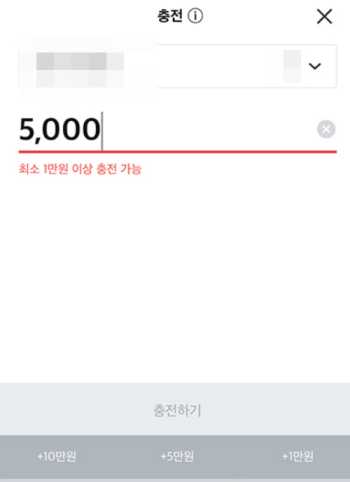 4. 충전 금액을 직접 입력하면 내가 원하는 금액만큼 충전할 수 있어요. 다만, 충전 시 최소 금액은 1만원 이상이어야 합니다. 그래서 예를 들어 5천원만 있어도 충전하려면 최소 1만원을 충전해야 한다는 점을 기억하세요.