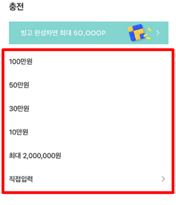 3. 충전 금액은 최대 200만원까지 가능해요. 10만원, 30만원, 50만원, 100만원 등으로 나누어져 있는데요. 더 작은 금액이나 필요한 금액만 충전하고 싶다면 직접 입력하기를 선택하면 됩니다.