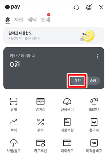 2. pay 홈화면에 들어가면 카카오페이머니가 있는 영역이 보이죠. 여기에서 충전 버튼을 찾아서 누르면 충전 화면으로 넘어갑니다. 충전을 원할 때 이 버튼을 누르면 원하는 작업을 바로 진행할 수 있어요.