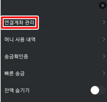 6. 메뉴에서 팝업창이 열리면 여러 가지 항목이 보이는데요. 여기서 '연결 계좌 관리'를 찾아 선택하면 계좌 변경 관련 설정으로 들어갑니다.