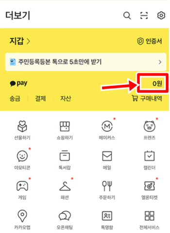 5. 카카오페이에서 계좌를 변경하려면 먼저 페이머니 옆에 있는 더 보기 아이콘을 눌러주세요. 이 아이콘을 누르면 추가적인 메뉴가 나옵니다.