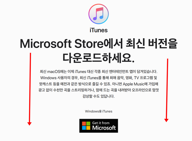 1. 아이튠즈를 다운로드하려면 먼저 해당 사이트에 접속해야 해요. 마이크로소프트 스토어에서 최신 버전을 받으라는 안내가 보일 거예요. 만약 Microsoft Store를 자주 이용한다면 바로 다운로드해도 되지만 계정이 없거나 조금 복잡하다면 화면을 스크롤해서 아래로 내려주세요.