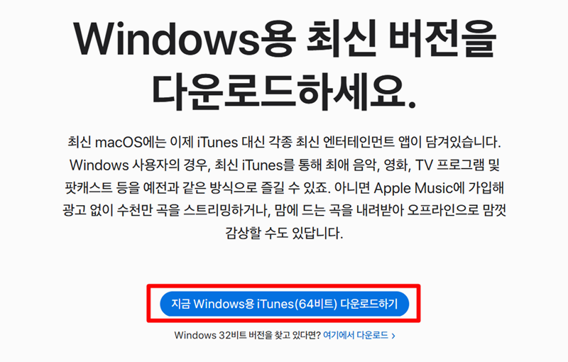 3. 이렇게 윈도우용 아이튠즈를 선택하면 마이크로소프트 스토어를 거치지 않고 바로 설치 파일을 받을 수 있는 버튼이 나옵니다. 이 버튼을 눌러서 설치 파일을 다운로드하면 바로 설치할 수 있어요.