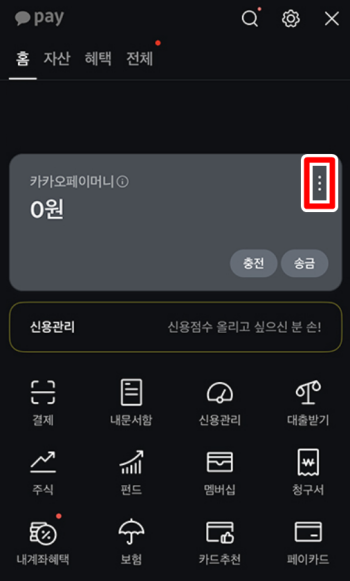 4. 카카오페이 화면에서는 여러 기능이 보이는데요. 여기서 페이머니 항목을 찾고 점 세 개 모양의 메뉴를 눌러야 합니다. 그러면 아래쪽에서 여러 가지 메뉴가 나타나는데 이 중에서 내역 보기를 선택하면 됩니다.