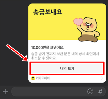 1. 카카오톡 채팅방에서 송금을 하면 보낸 금액이 메시지로 표시됩니다. 상대방이 받기 버튼을 누르기 전이라면 취소할 수 있는데요. 가장 먼저 해야 할 일은 송금 메시지를 길게 눌러 내역 보기를 여는 것입니다. 여기서 송금과 관련된 정보를 확인할 수 있습니다.